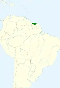 Es una especie de ave que se encuentra localizada en las tierras bajas costeras de Guyana y en el este Guayana Francesa.[2]