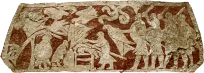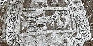 La piedra muestras seis paneles con un fondo mitológico, religioso y marcial, incluso una escena de sacrificio con un Valknut sobre el altar, y un barco tripulado con guerreros armados. Ha sido interpretada como la ilustración de la leyenda de Hildr. La piedra incluye una imagen de un guerrero colgado de un árbol con un Valknut cerca, considerado por ser símbolo del culto a Odín, validando los informes en referencia a los sacrificios humanos en el Paganismo nórdico.[2]