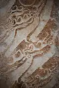 - Caras: Los rostros humanos son raros y generalmente se graban en la parte superior de las piedras. Estos rostros tienen la boca abierta, como si estuvieran cantando. Como la expresión vocal es un tema común e importante en el chamanismo, estos rostros podrían sugerir una relación entre las piedras de ciervo y el chamanismo.