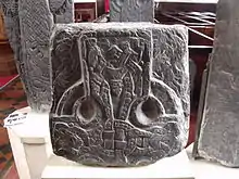 Esta imagen se ha interprerado como el dios Odín, con un cuervo o águila sobre el hombro, siendo devorado por el lobo Fenrir durante el Ragnarök. Cerca de la imagen hay una gran cruz y otra imagen paralela que ha sido descrita como el triunfo de Cristo sobre Satán.[6] Estos elementos combinados describen a la piedra como un ejemplo de sincretismo, una mezcla de creencias paganas y cristianas. Andy Orchard comenta que el pájaro sobre el hombro de Odín debería ser uno de los cuervos del dios Hugin y Munin.[7]