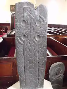 Este fragmento de una cruz se encuentra en la iglesia de Kirk Michael. La inscripción es de tipo futhark joven de rama corta y se grabó durante la Era vikinga.