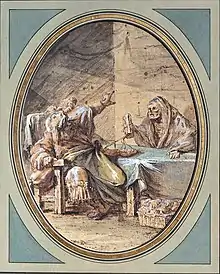 - Friné acusada de impiedad ante las areopágitas, gouache, Salón de 1763, 46,4 × 38,2 , París, museo del Louvre[8]