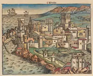 - Rhodiorum historia (enlace roto disponible en Internet Archive; véase el historial, la primera versión y la última). (Incunable. 1496)