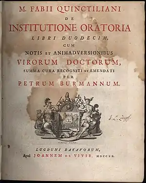 - Burman, Pieter [Petrus Burmannus] (1720a), M. Fabii Quinctiliani de Institutione Oratoria Libri Duodecim cum Notis et Animadversionibus Virorum Doctorum Summa Cura Recogniti et Emendati, Vols. I & II, Leiden: Joannes de Vivié.. (in Latin)