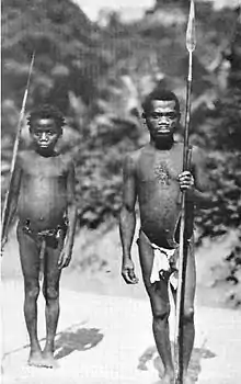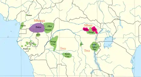 Los pigmeos del Congo hablan lenguas de las familias lingüísticas de Níger-Congo y Sudán Central. Se supone que los pigmeos alguna vez hablaron su propio idioma(s), pero, «al vivir en simbiosis con otros africanos en tiempos prehistóricos, adoptaron idiomas que pertenecen a estas dos familias».[9] Ha habido una mezcla significativa entre los bantúes y los pigmeos. Hay por lo menos una docena de grupos pigmeos, a veces no relacionados entre sí, suman al menos 350,000 en la cuenca del Congo. Los más conocidos son los Mbenga (Aka y Baka) de la cuenca occidental del Congo que hablan lenguas bantú y ubangiana; los Mbuti (Efe y otros) del Bosque de Ituri, que hablan lenguas bantúes y sudanés central, y los Twa de los Grandes Lagos, que hablan bantu Ruanda-Rundi. Todos los pueblos pigmeos atestiguados hablan idiomas de estas tres familias lingüísticas, y solo tres pueblos, los Aka, Baka y Asua, tienen su propio idioma.[10] Si bien existe una escasez de sitios arqueológicos excavados en África Central que podrían respaldar esta hipótesis,[11] los estudios genéticos han demostrado que las poblaciones pigmeas poseen antiguos linajes divergentes de ADN Y (especialmente los haplogrupos A y B) en altas frecuencias en contraste con sus vecinos (que poseen principalmente haplogrupo E).[12]