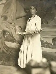 ![]() Pilar Montaner dando los últimos retoques al cuadro "el Dolor Humano", 1921. | ||