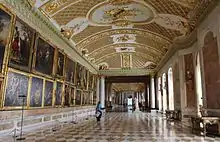 El vestíbulo de la galería está magníficamente diseñado con ornamentos ricamente dorados en el techo ligeramente curvado. El suelo está dispuesto en colores a juego con un patrón rómbico de mármol italiano blanco y amarillo. En las paredes verdes, los cuadros enmarcados están dispuestos densamente por encima y al lado de los otros en un estilo barroco.