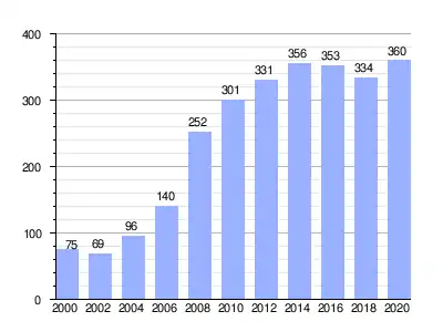 Gráfica de evolución demográfica de Pinares de Lepe entre 2000 y 2020 |
