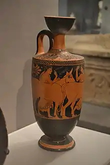 - Lécito, Museo Arqueológico Regional de Siracusa, número de inventario 26967, encontrado en Gela, motivo: escena de como.[2]