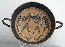 Su kílix de Berlín, con el regreso de los guerreros que transportan los cuerpos de los compañeros caídos en combate, el triste desfile solo está representado mediante de las pocas figuras pintadas en el tondo, cuyo carácter procesional parece deliberadamente acentuado por la ausencia de superposiciones y de profundidad.[3]
