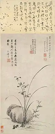 Hay una serie de motivos populares dentro del género de las pinturas de pájaros y flores. Un ejemplo bien conocido son los Tres Amigos del Invierno ( 歲寒 三 友 ), que consiste en bambú, pino y el albaricoque japonés (Prunus mume).[9]Como plantas de hoja perenne, simbolizan estabilidad, perseverancia y resistencia.[10] Las cuatro flores nobles (花中四君子) es otro motivo que incluye bambú, flores de albaricoque japonés, orquídeas y crisantemos. Representan las cuatro estaciones.[11] Las pinturas de bambú tienen su propio lugar importante en la historia del arte chino y generalmente se consideran como un género separado. En la dinastía Yuan la imagen del bambú se estaba convirtiendo en un tema inusualmente importante: el bambú simboliza el ideal de un científico que no puede someterse a la adversidad.[12][13]