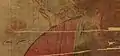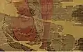 Dos características menores sugieren que esta pintura data de finales del siglo IX: el borde estrecha de la llama del nimbo y la configuración de la boca, que tiene un ligero retorno hacia abajo a los extremos de la línea de tinta entre los labios. La figura tiene un bigote bastante grueso y una barba leve, ambos en rojo y bastante diferente de los bigotes rizados, generalmente en verde, de los bodhisattvas.