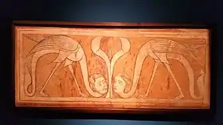 La mayor parte de la pintura mural románica conservada es de temática religiosa, pero también podemos encontrar decoraciones de carácter cortesano o profano en grandes centros monásticos, como es el caso de San Pedro de Arlanza, en Castilla. Este fragmento proviene de una sala de carácter palatino de la llamada Torre del Tesoro, sobre la sala capitular, donde había representaciones zoomórficas inspiradas en el bestiario. Hoy vemos en estas pinturas un grifo, ser fantástico con cuerpo de león y torso de águila, en una actitud vigilante. El estilo de las pinturas de Arlanza se relaciona con otras obras hispánicas del 1200 de clara influencia de la miniatura inglesa, lo cual puede apreciarse en el refinamiento y la precisión de los motivos, combinado con su monumentalidad.