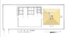 La entrada está desplazada hacia el oeste en el lado sur, aunque ahora se encuentra enterrada. Una escalera baja hasta 40 m en la profundidad y luego se abre a una pequeña cámara, de la que sale un pasaje corto, que termina como un callejón sin salida. En la parte superior de este callejón sin salida se encuentra la entrada a otro pasaje, que estaba bloqueado con una barrera de granito de 20 t. Detrás de esta hay otra cámara, de la que se ramifican dos pasillos. El primero conduce directamente al norte y la campaña de investigación se detuvo entre agua y barro. El segundo corredor conduce al este hacia el centro de la pirámide y termina en otra cámara. De nuevo escondido en el techo y provisto de un bloque de piedra que cae, el corredor ahora gira hacia el norte nuevamente. La misma construcción sigue en la esquina noreste, pero aquí el paso estaba cerrado por un bloque. Detrás de esta barrera se pasa a la antecámara, en cuyo muro sur un hueco conduce a la cámara funeraria.