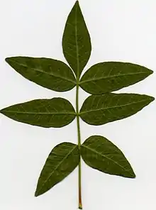 Árbol que puede llegar a alcanzar de 8 a 12 m de altura, parecido al fresno o el algarrobo; el diámetro del tronco llega a alcanzar 1 m a los doscientos años. Es un árbol de crecimiento lento que llega a superar los 1000 años de edad. Su copa es espesa y enmarañada y la corteza fracturada y de un color gris ceniciento. Las ramas más viejas presentan el mismo diseño, fracturado y ceniciento, lo que le da al árbol aspecto de ser muy viejo. Hojas ovales, casi sésiles, brillantes por arriba, de color verde oscuro, de 7-9 folíolos, imparipinnados con pecíolos un poco alados; flores en racimos laxos, las masculinas y las femeninas sobre árboles diferentes. Las flores son unisexuales, pequeñas, de un verde discreto; fruto grueso como un guisante, rojizo luego cambiando a azul.[2] En las zonas más frías echa las hojas en mayo y caen en noviembre. Plantas dioicas, en algunas comunidades dominan los ejemplares hembra. Crece en encinares y robledales esclerofilos. Los frutos maduran de julio a octubre, comenzando a dar frutos a la edad de 8 a 10 años, abundantes frutos en 2-3 años.