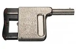 La pistola no posee gatillo, se dispara por presión de la palma de la mano sobre la parte trasera de la misma. Los cartuchos se introducían por una ventanilla de la parte superior, con cada presión de la palma de la mano se introducía un cartucho en el cañón, percutiéndolo al final de su recorrido, al aflojar la presión de la mano la vaina disparada era expulsada por la ventanilla de carga y un nuevo cartucho quedaba preparado para ser disparado.[1]