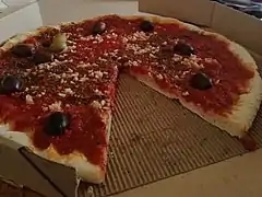 - Sobre la pizza ya preparada se agrega aceite de oliva, aceitunas negras, hojas de albahaca y orégano.