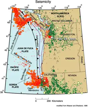 El último gran terremoto en la placa Juan de Fuca fue el terremoto de Cascadia de magnitud 9. De los archivos japoneses se deduce que ocurrió el martes 26 de enero de 1700.