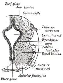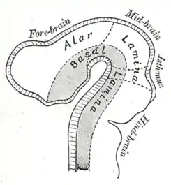 Inicialmente, los lados izquierdo y derecho de la placa basal son continuos, pero durante la neurulación quedan separados por la placa del piso, y este proceso está dirigido por la notocorda. La diferenciación de neuronas en la placa basal está bajo la influencia de la proteína Sonic hedgehog liberada por estructuras ventralizantes, como la notocorda y la placa del piso. [1]