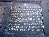 Aquí estuvo durante siglos el Carbayón, árbol simbólico de la ciudad, derribado el II de octubre de MDCCCLXXIX. La Corporación municipal acordó el XXIV de marzo de MCMXLIX la colocación de esta placa que perpetúe su memoria.