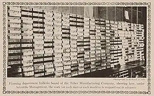 Los métodos y herramientas modernos de planificación de la producción se han desarrollado desde finales del siglo XIX. En la Gestión científica , el trabajo para cada hombre o cada máquina se describe de antemano (ver imagen). Kaplan (1986) resumió que "la demanda de información para la planificación y el control aparentemente surgió en la primera mitad del siglo XX cuando las empresas, como las fábricas de textiles y ferrocarriles, tuvieron que diseñar procedimientos administrativos internos para coordinar los múltiples procesos involucrados en el desempeño de su actividad básica (la conversión de materias primas en productos terminados por las fábricas textiles, el transporte de pasajeros y la carga por los ferrocarriles. " [7]