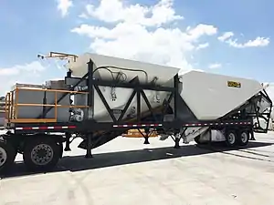 - Plantas móviles: son las instalaciones destinadas a trabajar en una obra o proyecto concreto. Tras la finalización del mismo, la planta es desmontada, trasladada y ensamblada en otro lugar de trabajo. La estructura de la planta, suele incorporar un tren de rodadura, de manera que se necesita solamente una cabeza tractora para realizar el transporte de las principales partes de la planta.