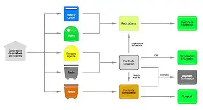 Este esquema de gestión ha obligado a la creación de infraestructuras adecuadas para la separación de los residuos mezclados, principalmente los depositados en los contenedores de envases ligeros (amarillo) y resto (gris), con el objeto de obtener flujos de materiales con destinos alternativos a la eliminación en Depósito Controlado.[3]