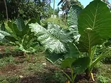 El taro (Colocasia esculenta), a veces llamado "taro verdadero", es uno de los cultivos más antiguos previo a la expansión austronesia.[6] El taro se encuentra ampliamente distribuido en las regiones tropicales y subtropicales del sur de Asia, el este de Asia, el sudeste de Asia, Papua Nueva Guinea y el norte de Australia; siendo una especie altamente polimórfica, lo que dificulta su taxonomía y su distinción entre los tipos silvestres y cultivados. Se cree que fueron domesticados de forma independiente en múltiples ocasiones, y diversos autores dieron como posibles ubicaciones de domesticación a Nueva Guinea, el sudeste de Asia continental y el noreste de India, basándose en gran medida en el rango nativo asumido de las plantas silvestres.[69][70][71] Sin embargo, los estudios más recientes han señalado que el taro silvestre puede tener una distribución nativa mucho más grande de lo que se creía anteriormente, y pueden ser que algunas especies silvestres puedan ser indígenas de otras partes de la isla del sudeste asiático.[72][73]