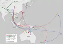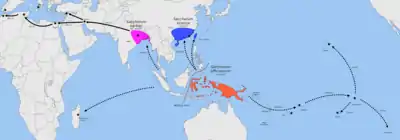 Uno de los acontecimientos de migración humana más importantes fue el asentamiento marítimo de las islas del Indo-Pacífico por los pueblos austronesios, el cual se cree comenzó alrededor de los años 5,500 a 4,000 AP (3500 a 2000 a.C.). Estas migraciones fueron acompañadas por un conjunto de plantas y animales domesticados, semi-domesticados y comensales transportados a través de canoas y catamaranes, los cuales permitieron a los primeros austronesios prosperar en las islas del Sudeste Marítimo de Asia, Oceanía Cercana (Melanesia), Oceanía Remota (Micronesia y Polinesia), Madagascar, y en Las Islas Comoras.[2][3]