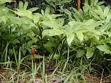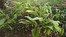 La planta de ti (Cordyline fruticosa) es una planta con forma de palma que crece de 3 a 4 m (9.8 a 13.1 pies) de altura, con un atractivo grupo de hojas ampliamente alargadas en forma de abanico y en espiral en la punta de sus troncos delgados. Tiene numerosas variaciones de color, que van desde plantas con hojas rojas hasta cultivares verdes, amarillas y abigarradas. Se desconoce su distribución nativa original, pero se cree que es nativa de la región que va desde Bangladés, hasta el sudeste asiático continental, el sur de China, Taiwán, la isla del sudeste asiático, Nueva Guinea y el norte de Australia. Tiene una mayor diversidad morfológica en Nueva Guinea y se cree que se ha cultivado allí extensamente. Es comúnmente identificada erróneamente como "Dracaena", junto con miembros del género Cordyline, debido a sistemas de clasificación pasados.[91][92]