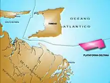 La plataforma Deltana es una zona marítima venezolana que se encuentra costa afuera, en la plataforma del delta del Orinoco aproximadamente a 90 km al noreste de la isla Tobejuba en el estado Delta Amacuro, y aproximadamente a 233 km al sureste de Güiria, Estado Sucre, Venezuela (Fig.1). ocupa un área de 90 300 km² pertenece a la Fachada Atlántica Venezolana es la parte de las áreas marinas y submarinas donde el territorio venezolano se proyecta hacia el océano Atlántico, esta aun no está definida por estar pendiente la solución de la controversia del Esequibo y la delimitación con Grenada y Guyana[1]