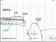 Como parte de la zona de fallas mayores se encuentran escarpes en formas de arcos, asociados con deslizamientos submarinos que parecen activos (Fig. 6). Los escarpes de gran magnitud están conectados y tienen longitudes de aproximadamente 1 km, desplazamientos hacia el noreste y alturas que van desde 20 m hasta 29 m. Hay escarpes menores en forma de arco, que no están conectados. Tienen longitudes de aproximadamente 250 m, desplazamientos hacia el noreste, a aproximadamente 450 m al este de los otros y con alturas de 5 m y 6 m. Los sedimentos asociados con los deslizamientos se movieron hacia abajo casi cohesivamente, aunque los horizontes están claramente alterados. El espesor de estos sedimentos se encuentra en el orden de 18 m. Los escarpes menores en forma de arcos están conectados al sur-sureste del área. Datos de sonar de barrido lateral y penetrador de fango adquiridos en el área sugieren que esta zona se encuentra al comienzo del deslizamiento de los escarpes y se ve una separación menor con coherencia de los horizontes internos. Se determinó que los deslizamientos se formaron en una sucesión de fallas desplazadas por terremotos.