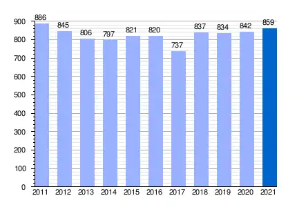 Gráfica de evolución demográfica de Playa Salobreña entre 2011 y 2021 |
