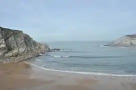 Está considerada una de las playas más bellas de Cantabria por el tómbolo que en las bajamares la une a la Isla del Castro. Se encuentra rodeada por un acantilado y su acceso es peatonal a través de unas escaleras. Actualmente el acceso es realmente complicado pues las fuertes mareas se llevaron arena y hay que ayudarse de cuerdas para entrar y salir. Hay una cascada de agua cuyo origen no está del todo claro si es filtrada y de origen natural o un desagüe.