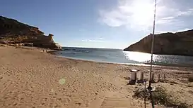 Forma una media luna natural con abundante arena y se ubica en entorno paradisíaco. La montaña que la protege, erosionada por el efecto del mar, ha dejado un paisaje de sumo interés geológico. Se encuentra rodeada de unos llamativos acantilados salvajes y naturales donde podemos observar diferentes formaciones de roca arenisca con cuevas. En ellas antiguamente habitaban personas, las cuales se encargaban de cocer el esparto.