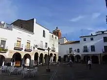 Sus soportales apoyados sobre arcos de ladrillos, sin recubrimiento tras la última reforma de 1975, que descansan en columnas de mármol y pilastras de granito de variados estilos y formas, acogieron en un pasado al comercio local de la villa; hoy acogen a los clientes de los bares que dan vida a la misma y nos deleitan con sus raciones, entre las que destacan las célebres alitas de pollo. Su espacio central, testigo del ir y venir de la gente, acoge una cruz de forja sobre una columna de mármol y es escenario de teatro y música en algunas de las fiesta de la ciudad.