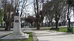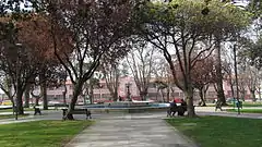 ![]() La plaza en 2012, con sus árboles característicos y su pileta. Al fondo, el colegio de niñas María Inmaculada | ||