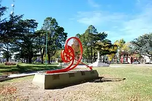 Del lado de la calle Sáenz Peña posee una escultura creada por los arquitectos Salvador Roselli y Julio César Lazcano. Se llama "Origen" y está realizada íntegramente en materiales ferroviarios mediante técnicas de ensamblado y soldadura.