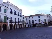 Está casi totalmente porticada pues sólo una de la casas en la cara norte no tiene soportales, precisamente la situada en el punto en que hasta el siglo XVI parece que la plaza comunicaba con la calle Badajoz, siguiendo el eje norte-sur de la villa. A ella se asoman casas de dos y tres plantas de porte señorial y sigue siendo lugar de actividad comercial; bares, hoteles, librería, kioscos, comercios. Su zona peatonal es muy frecuentada por los zafrenses en sus múltiples terrazas de verano. Centro cotidiano de la actividad de la ciudad, en ocasiones se convierte en escenario al aire libre: festivales, carnavales…