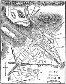 Mapa de la ciudad del Cusco de la década de 1860. Nótese en la parte derecha el inicio del camino al Collasuyo y la existencia del espacio que hoy ocupa la Plaza Limaqpampa