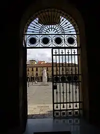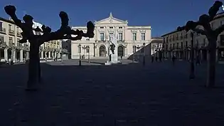 - Casa Consistorial: el Ayuntamiento de Palencia presenta la imagen típica de un ayuntamiento. Es un edificio de fachada rectangular dividida en tres partes verticalmente y en dos horizontalmente.Plaza Mayor vista desde el Ayuntamiento, en el centro, el Monumento a Berruguete.