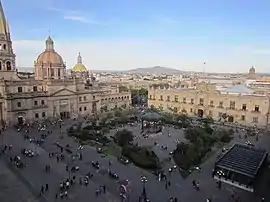 La capital jalisciense se fundó el 14 de febrero de 1542 por el conquistador Cristóbal de Oñate donde ahora se encuentra la Plaza Fundadores, pero tan solo dos décadas después en 1561 se creó una nueva plaza mayor en el sitio actual para que la ciudad no estuviera tan cerca del río San Juan de Dios y se pusiera a riesgo de inundación. Su trazado en forma de damero, semejante a un tablero de ajedrez. De esta forma se planificó la construcción de una plaza central en torno a la cual se erigieron los principales edificios administrativos: la catedral, el obispado, las casas reales, las casas consistoriales, la real contaduría, la casa de moneda, el seminario y el convento de la Merced.[2]
