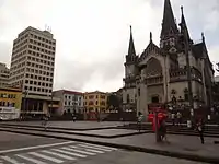 Costado Sur, Catedral Basílica Nuestra Señora del Rosario de Manizales y costado oriental, observando el edificio Alejandro Gutiérrez, la sede del Banco Agrario y la construcción adyacente.