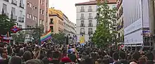La plaza de Chueca, antes plaza de San Gregorio Magno,[1] es un pequeño espacio peatonal de la ciudad española de Madrid, en el barrio de Justicia, distrito Centro, enmarcado por la calle de Gravina, al este, y la de Augusto Figueroa al oeste, a un costado del inicio de la Gran Vía de Madrid. Dedicada desde 1943 al compositor madrileño Federico Chueca,[lower-alpha 1] da nombre a todo el barrio. En el inicio del siglo XXI aparecía en las guías turísticas como corazón de la comunidad gay en la capital de España,[2] aunque el dato aún no figuraba en la obra de algunos cronistas, estudios callejeros y enciclopedias sobre Madrid.[3][4]
