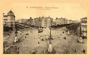 Esta plaza no estaba proyectada en el Plan de Ensanche de Ildefonso Cerdá, ya que en realidad no es una plaza como tal, sino el espacio de intersección entre la avenida Diagonal y el paseo de Gracia. Antes de tener un nombre oficial la zona era conocida como el «Cinco de Oros» (en catalán, Cinc d'Oros), ya que tenía cuatro rotondas en cada esquina y una más grande en el centro, con lo que en vista aérea recordaba esa carta de naipe. En 1906 la zona fue urbanizada por el arquitecto municipal Pere Falqués, quien situó un conjunto de seis farolas dispuestas alrededor de la rotonda central. Posteriormente, el aumento del tráfico en este céntrico cruce hizo que se retirasen las farolas en 1957, que más tarde fueron recolocadas en la avenida de Gaudí (1985).[1]
