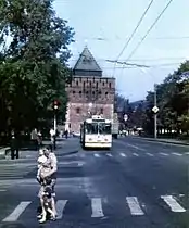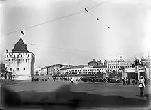 En 1935-1937, el Instituto de Leningrado "Giprogor" desarrolló un plan general para la ciudad socialista de Gorki (el nombre de Nizhni Nóvgorod en el período soviético), lo que implicó un cambio radical en la estructura de planificación existente. La plaza Soviética de aquella época estaba diseñada alrededor, su área aumentó significativamente debido a la demolición de algunas de las paredes y torres del Kremlin, que se percibió en esos años como "un monumento al feudalismo avaricioso ya la autocracia zarista, Páginas terribles del pasado sangriento".