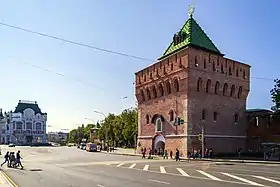La torre de paso estaba conectada por un puente arqueado de piedra con una cabeza de puente: un arquero de desviación pentagonal rodeado por un foso. Por lo tanto, los ataques al Kremlin fueron repelidos durante las incursiones del Kanato de Kazán. Unos años después de la construcción de la torre, en 1378, frente a ella se construyó una iglesia de madera con el nombre de San Demetrio de Tesalónica, que, según una versión, dio el nombre a la torre.[2] En 1641 la iglesia de San Alexei Metropolitano.[3] En 1697, la iglesia de madera de Demetrio de Tesalónica fue reemplazada por una de piedra. Se construyó la Catedral de la Anunciación (en ruso, Благовещенский собор, Blagoveshchensky sobor) y la plaza se llamó Blagoveshchenskaya (Anunciación).