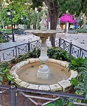 En la plaza también se sitúa una fuente de mármol blanco adornada con peces y caras de león y el mosaico que señala el punto nº 4 de la Ruta de Fermín Salvochea.