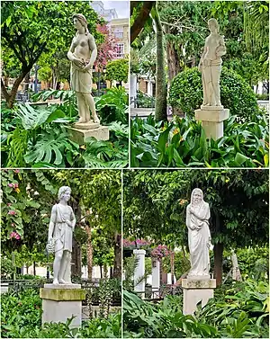 Además de la estatua a Emilio Castelar, la plaza cuenta con un grupo escultórico Las Cuatro Estaciones, muy de moda desde finales del siglo XVIII para decorar parques, jardines y palacios.