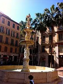 La plaza albergó desde el siglo XVII la conocida como fuente de Génova o de Carlos V (realizada en mármol un siglo antes y ubicada en este espacio) y que provenía de la ciudad italiana. La fuente fue trasladada al parque de Málaga hasta la peatonalización de la vecina calle Marqués de Larios en 2002, cuando fue restablecida a su lugar primigenio.[8]